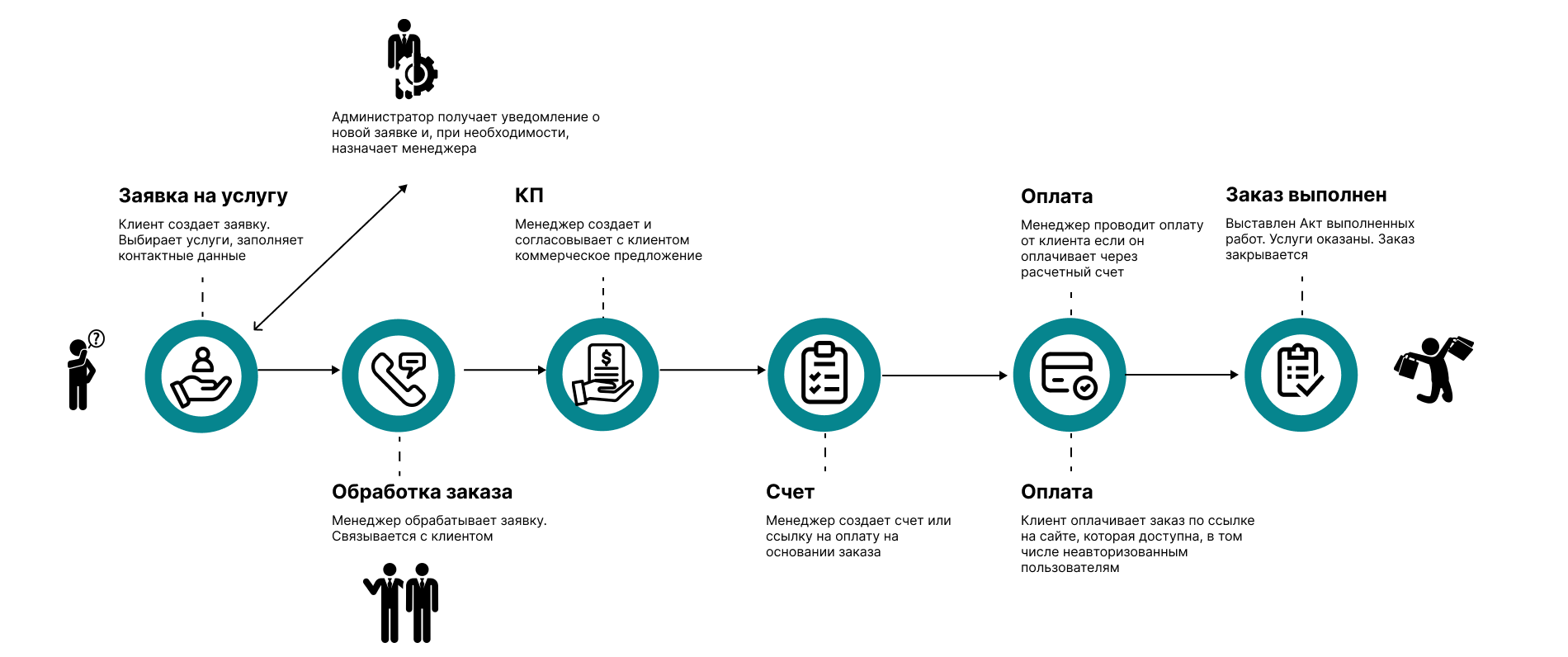 Обработка заказов через личные кабинеты менеджера компании и клиента.