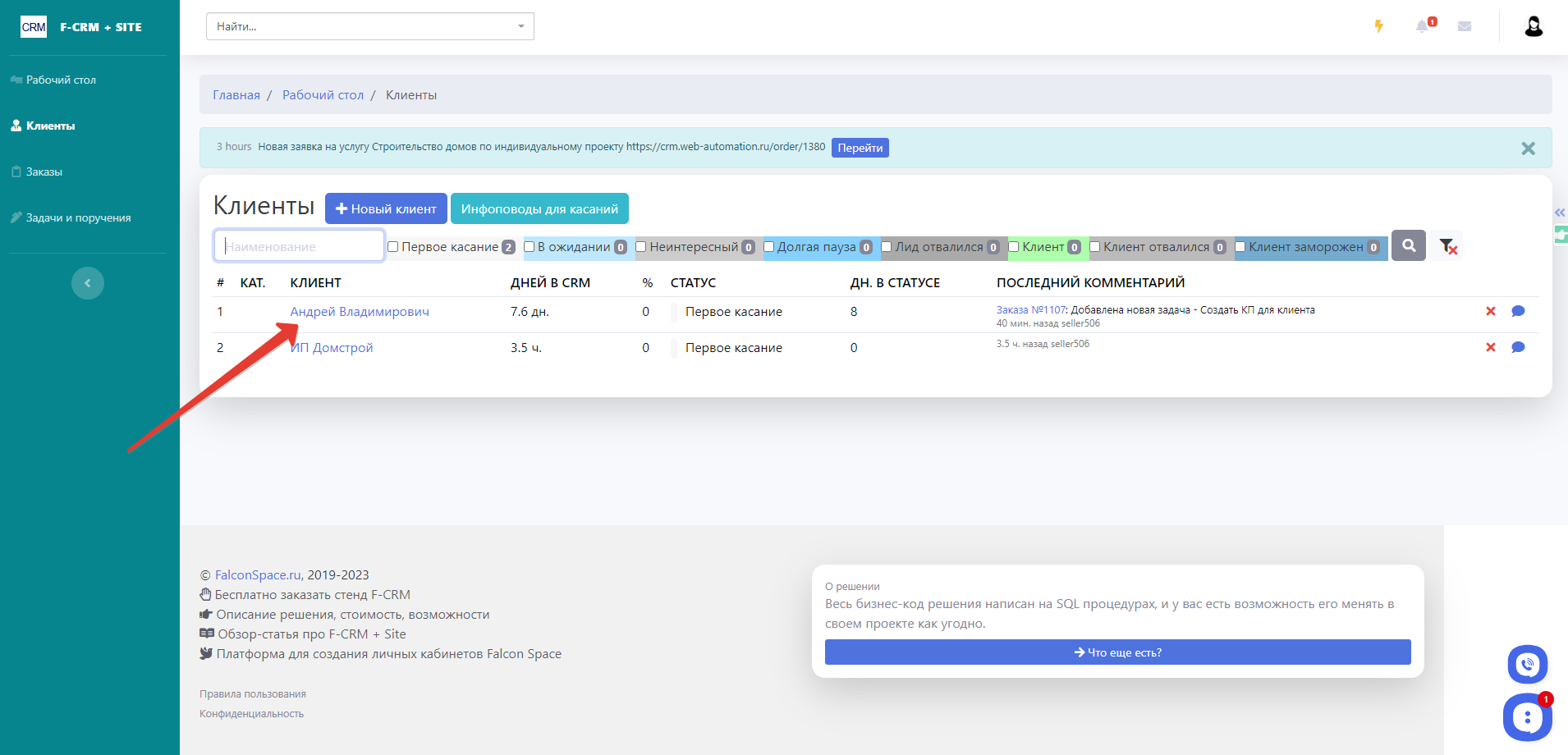 2. В кабинете менеджера и руководителя на страници "Клиенты" автоматически создается новый лид по данной заявке: