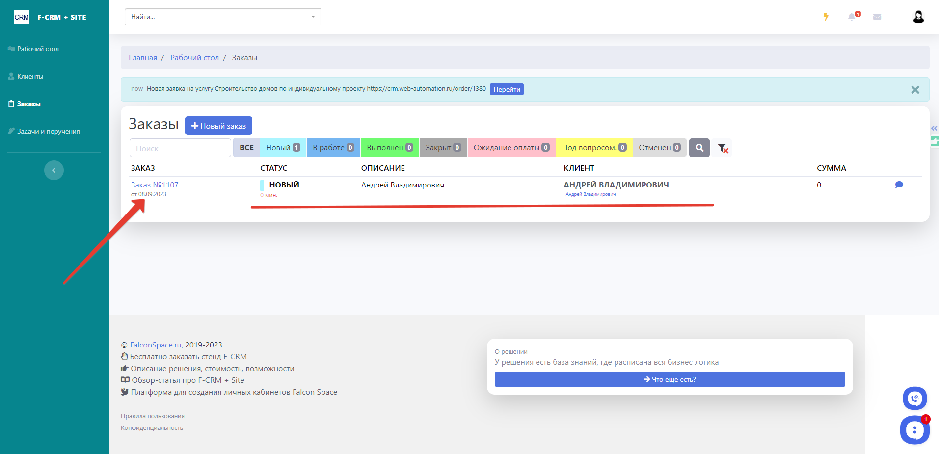 2. В кабинете менеджера и руководителя на странице "Заказы" автоматически создается новый заказ по данной заявке: