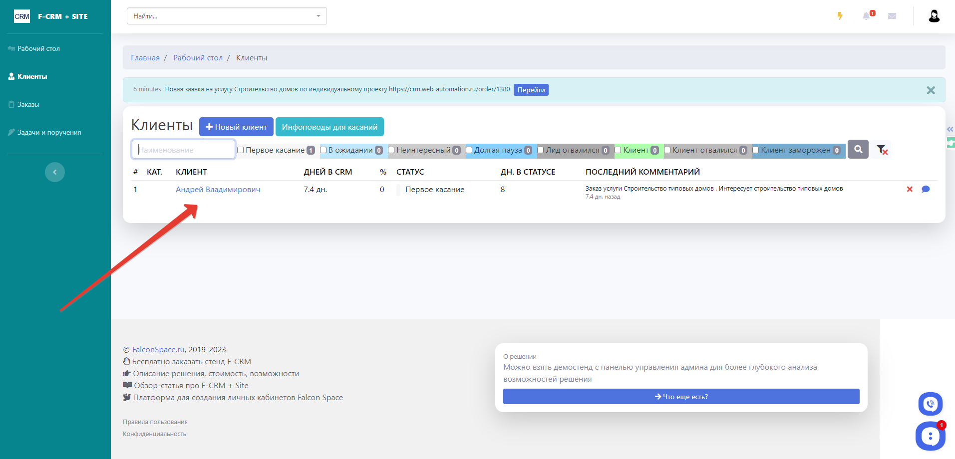 3. На странице "Клиенты" автоматически генерируется новый лид и его контакты: