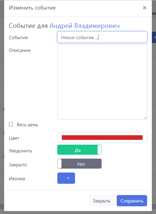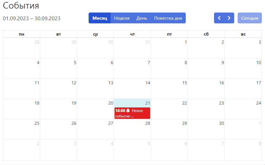На карточке клиента и на странице /events выводится календарь, где мы можем планировать будущие события по клиенту и по общим вопросам.