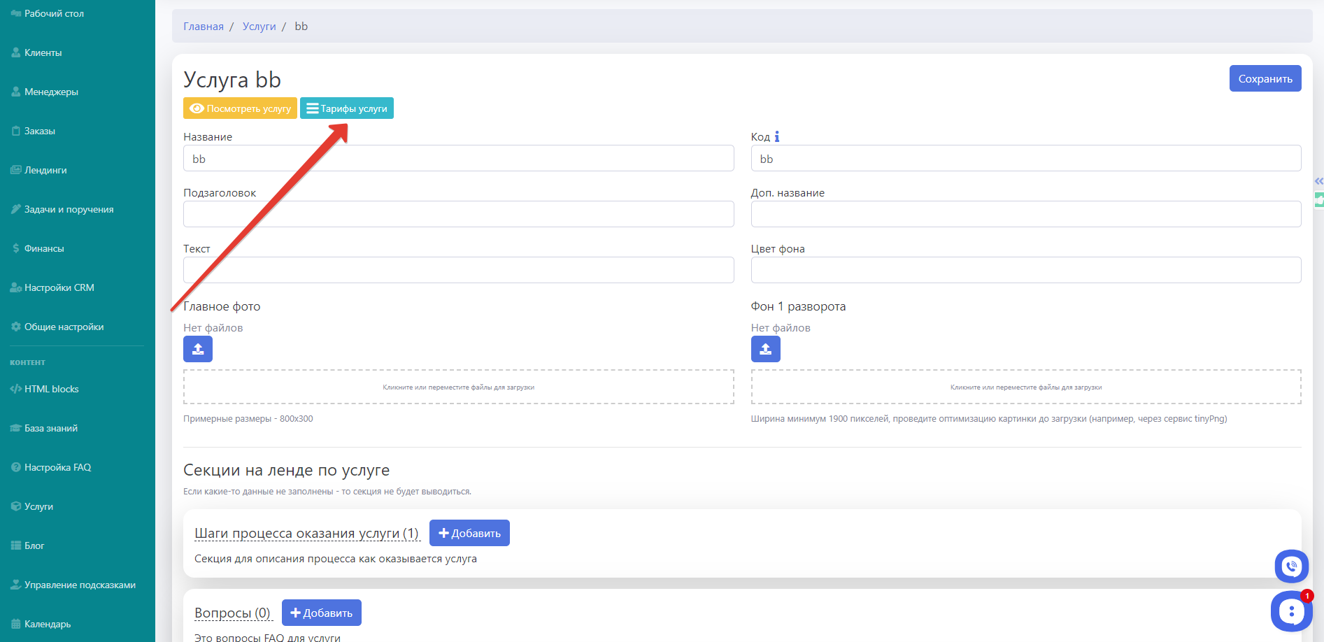 На странице услуги необходимо нажать на кнопку "Тарифы услуги":