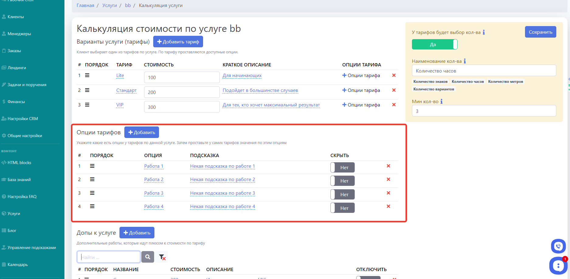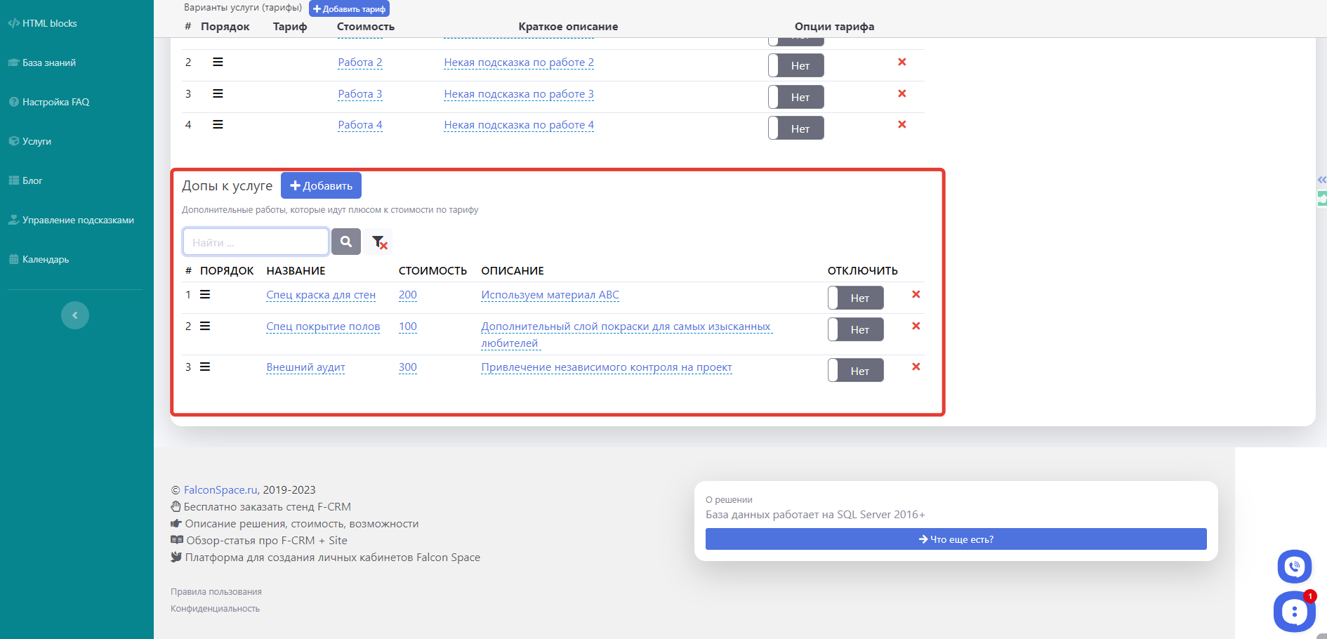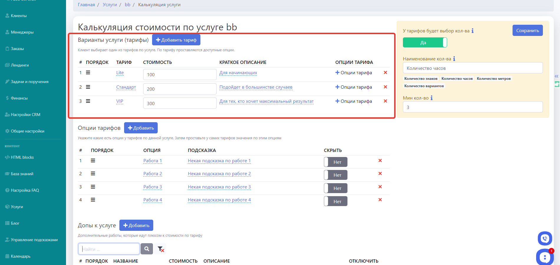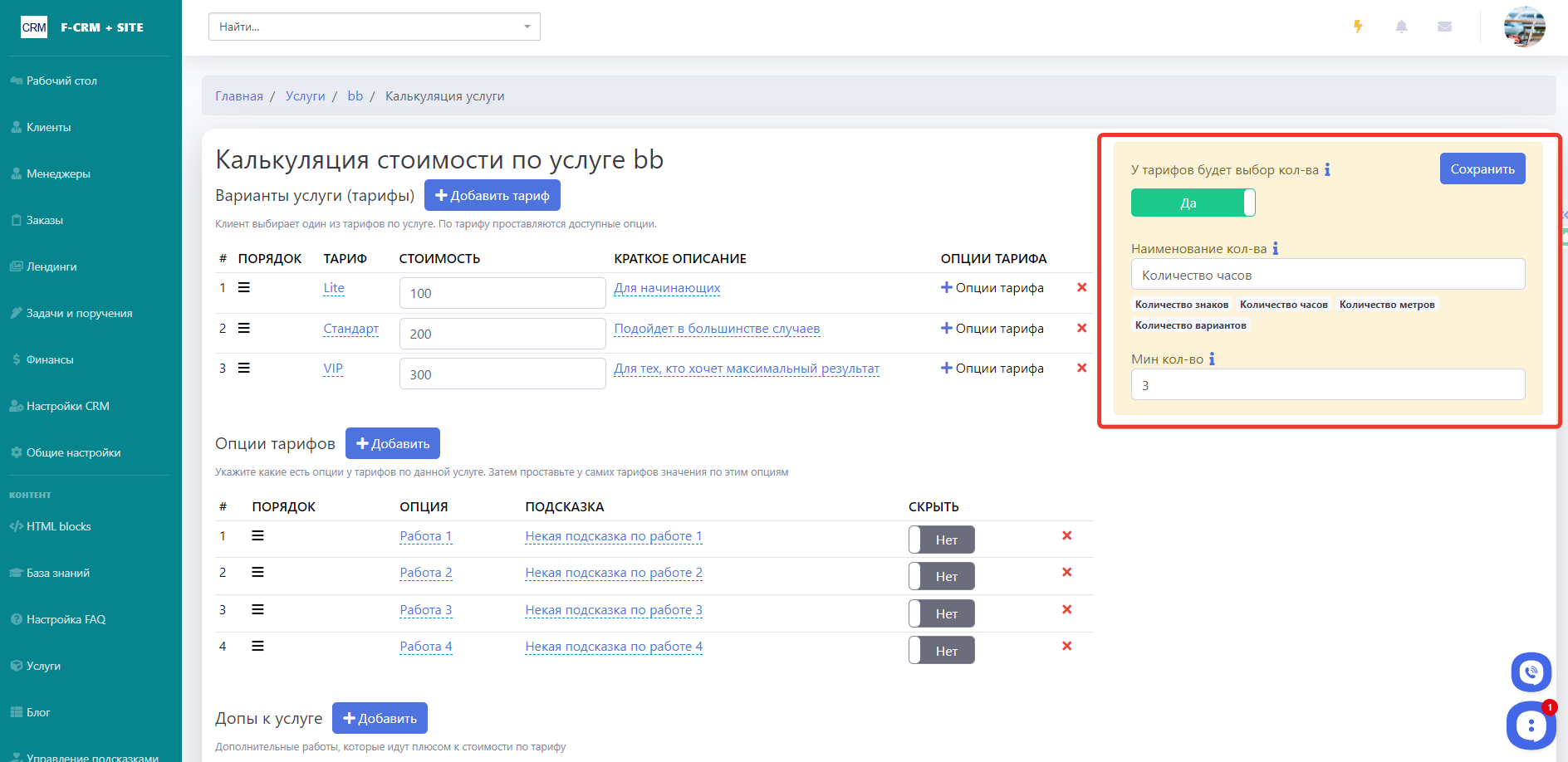 В решении F-CRM + Site реализована возможность калькуляции стоимости услуг для Клиентов:
