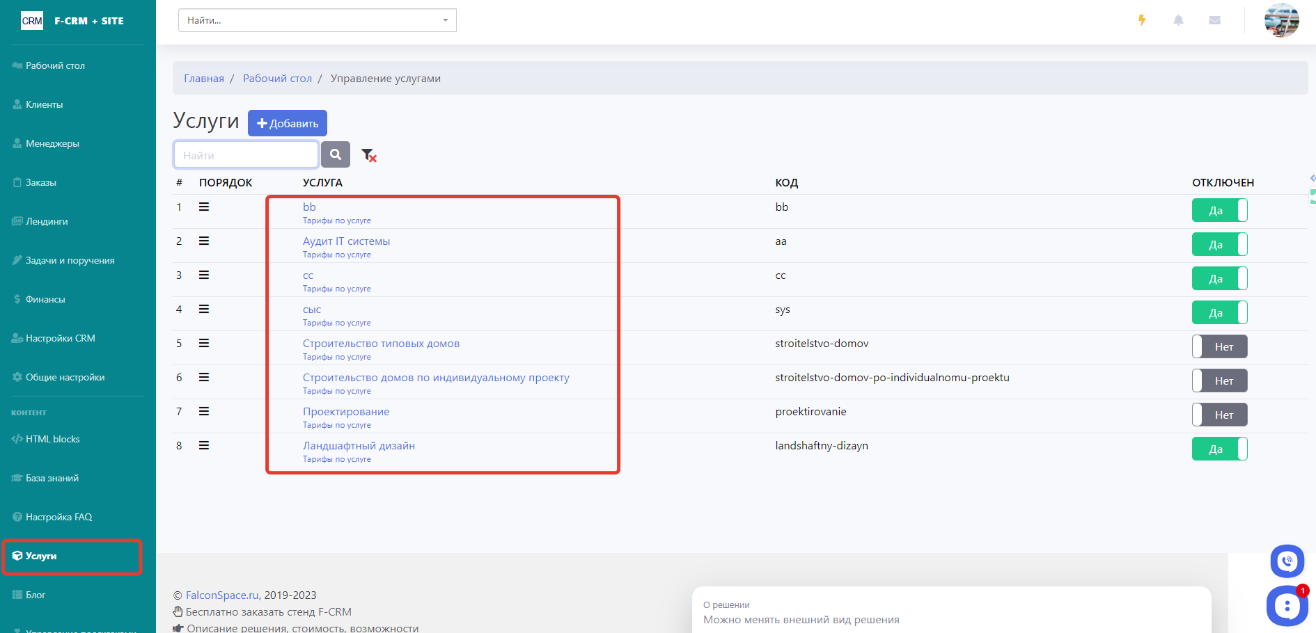 Для того, чтобы настроить форму калькуляции, администратору сайта необходимо перейти на страницу "Услуги" и выбрать услугу, для которой необходимо создать форму калькуляции: