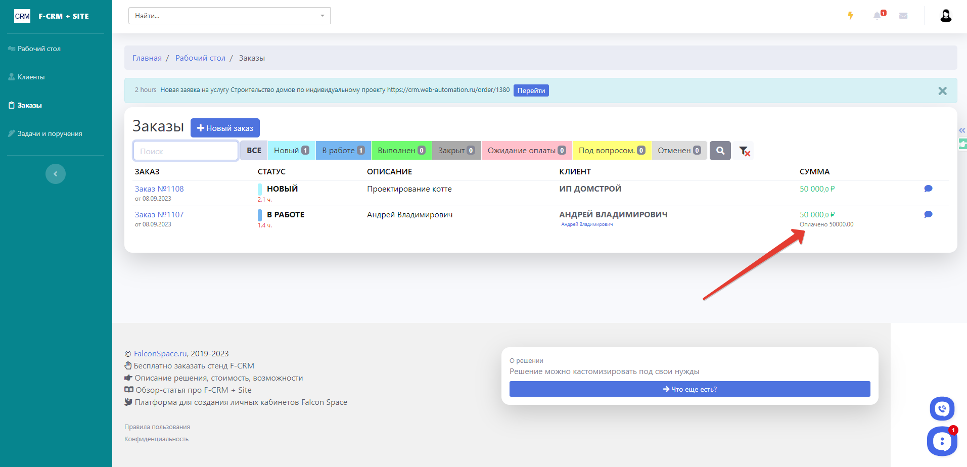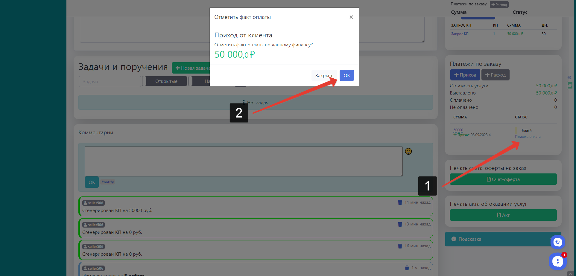3. Для того, чтобы отметить факт оплаты необходимо нажать на "Пришла оплата", а затем подтвердить факт прихода средств от клиента: