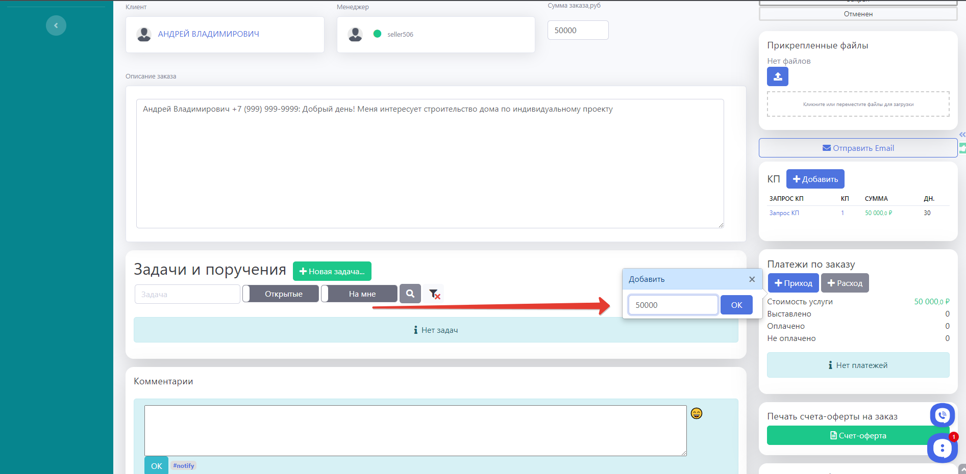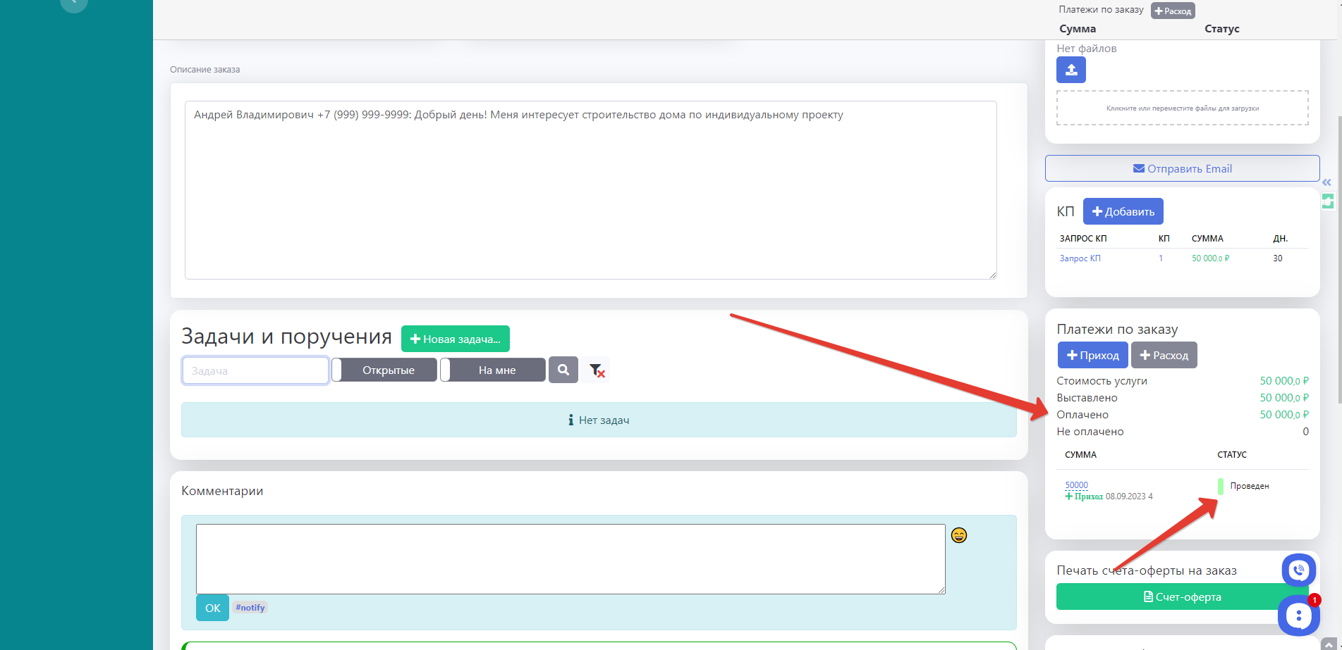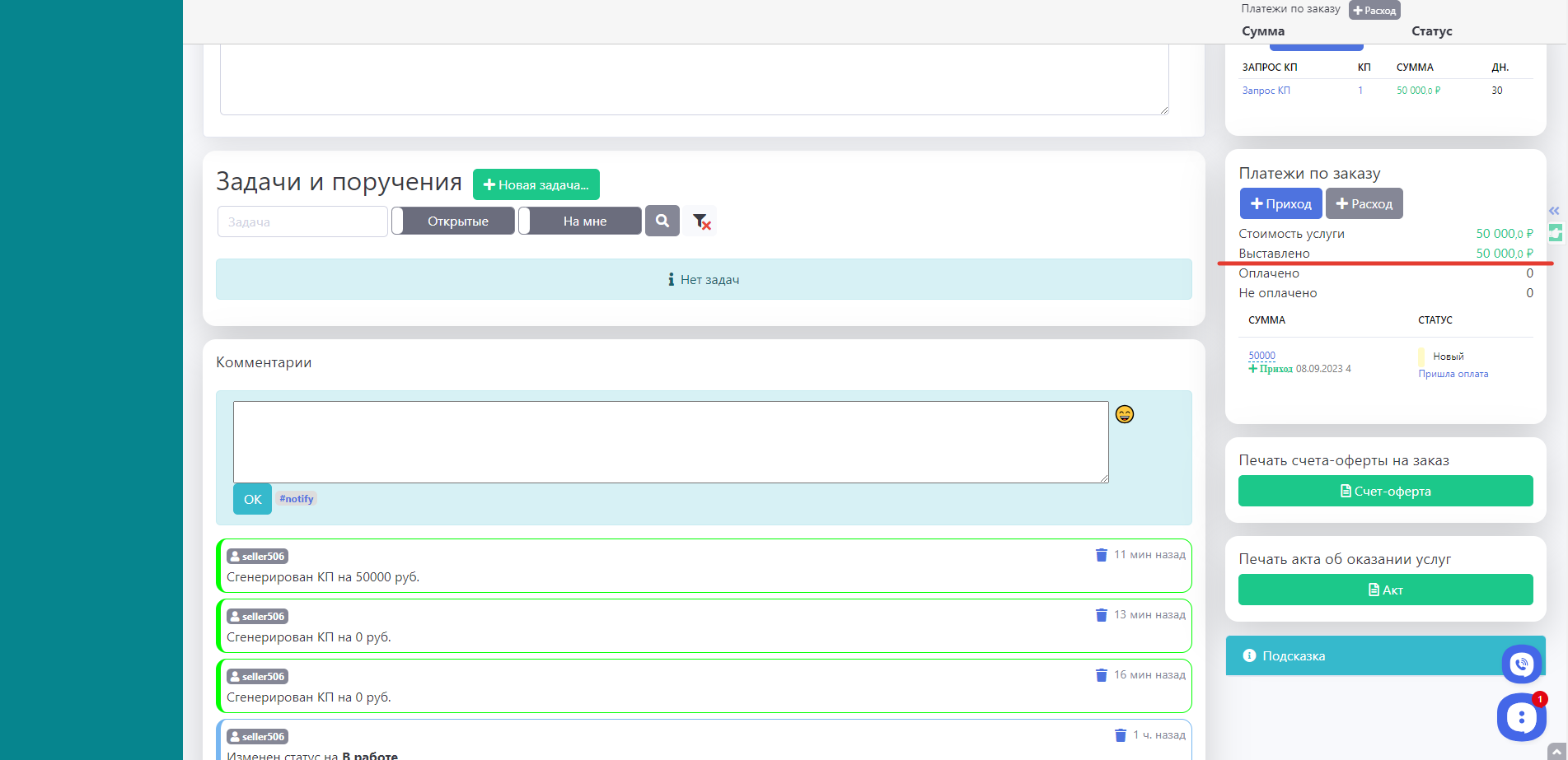 На странице заказа менеджер и руководитель могут осуществлять контроль платежей по заказу.