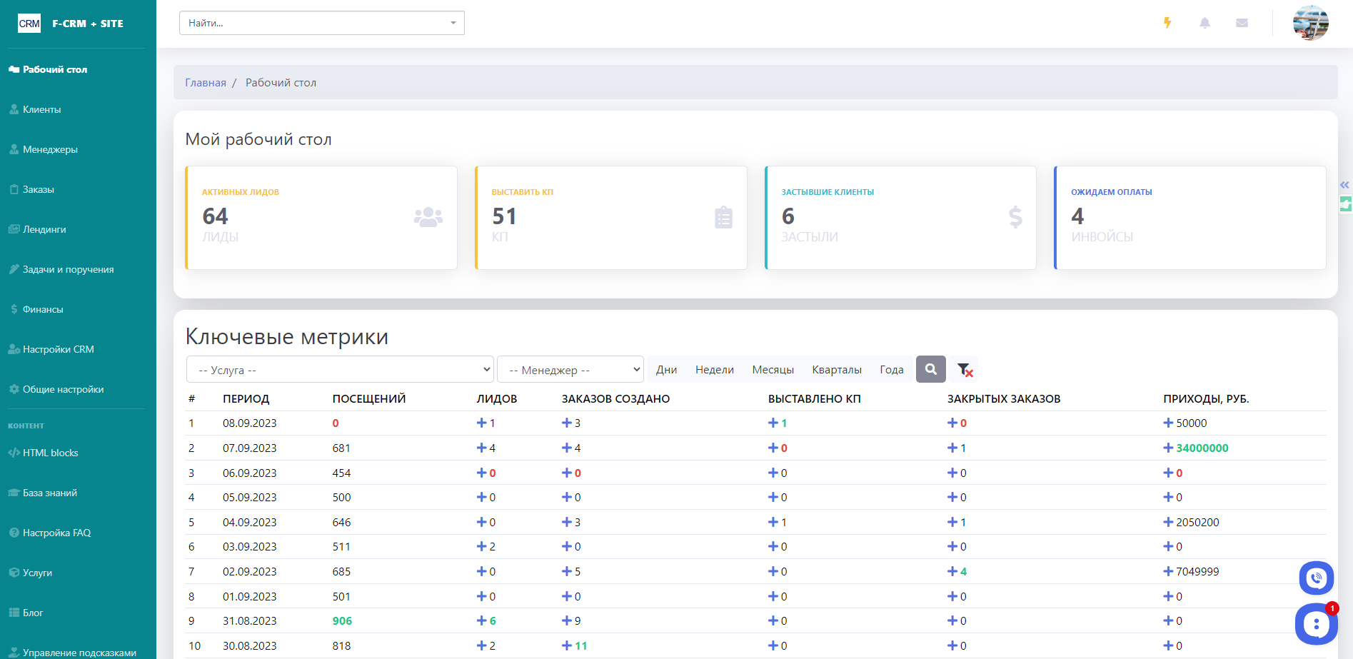 Кабинет руководителя предназначен для контроля метрик и работы менеджеров, учета финансов и пользователей, управления CRM и контентом.