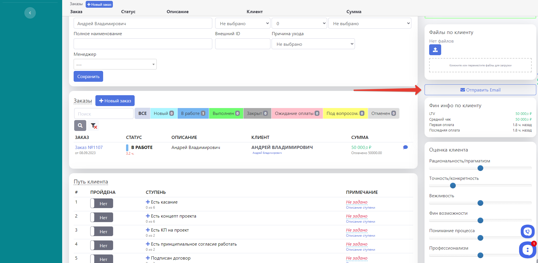 На странице клиента менеджер и руководитель могут осуществлять отправку e-mail клиенту.