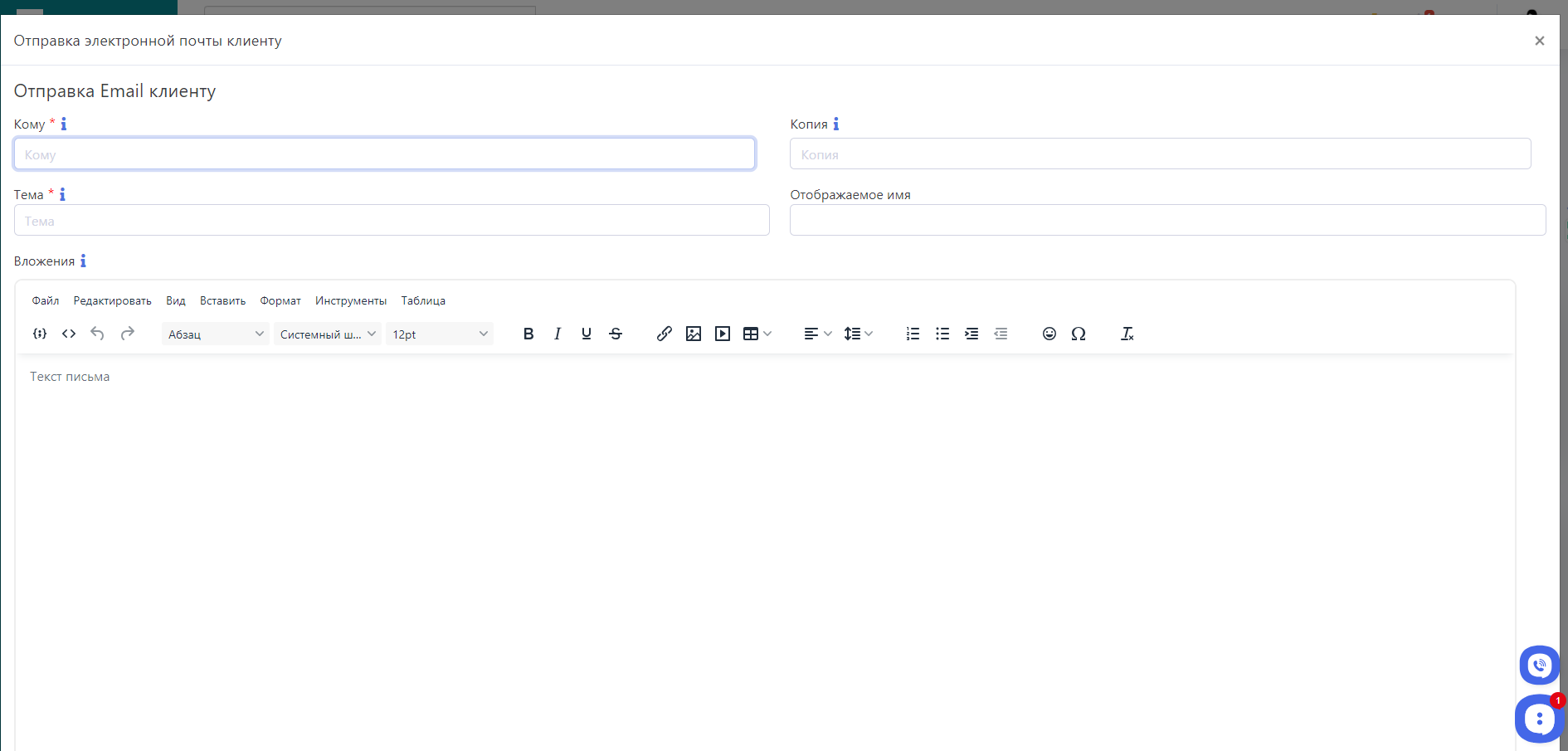 После нажатия на кнопку, откроется окно с текстовым редактором, в котором менеджер и руководитель могут создать и отправить электронное письмо клиенту: