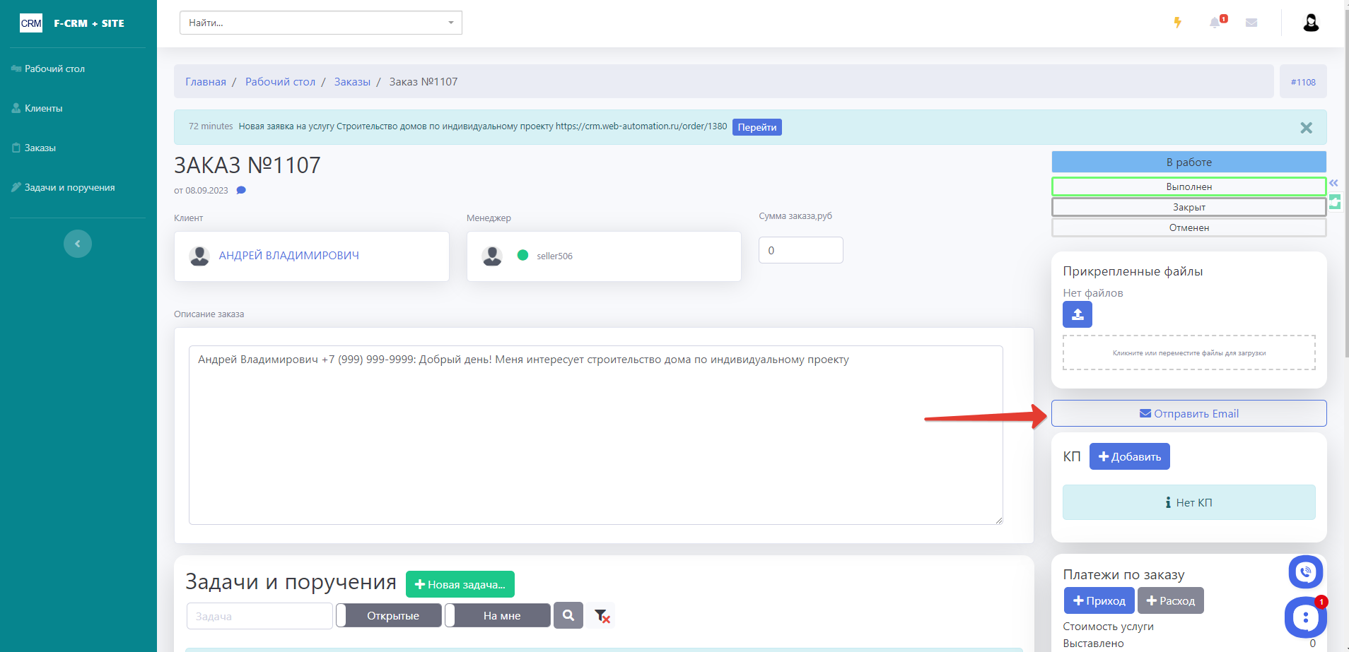 На странице заказа менеджер и руководитель могут осуществлять отправку e-mail клиенту.