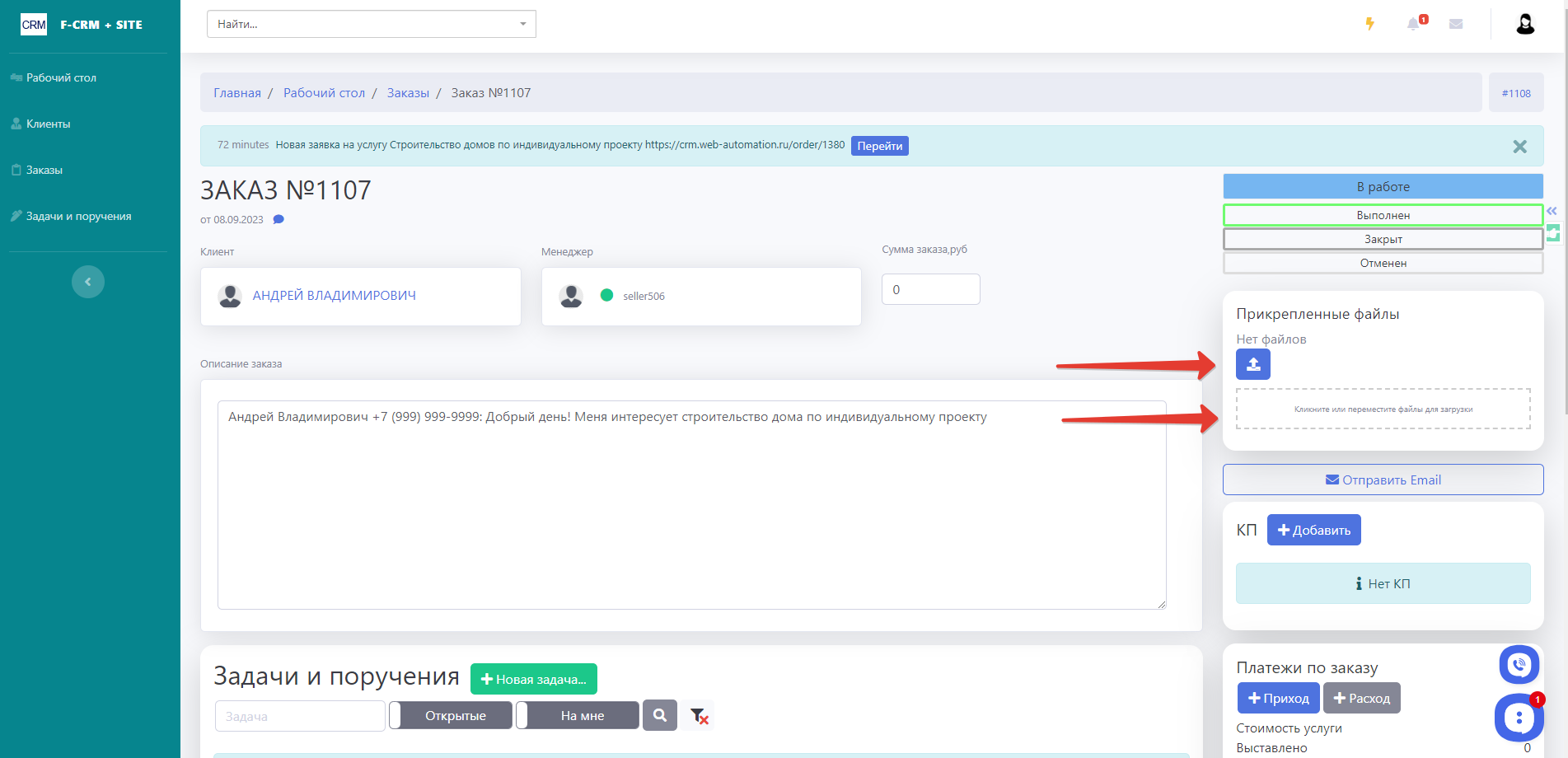 - Работа с заказами Автоматическое создание заказа через заявку Ручное создание заказа через кабинет менеджера Обработка заказа Статус заказа Прикрепленные файлы Отправка Email клиенту Создание коммерческого предложения Создание шаблона коммерческого предложения Генерация Счета-оферты и Акта об оказании услуг Контроль платежей по заказу Комментарии Фильтрация по заказам Оплата по заказу через платежный шлюз Тинькоф Задачи и поручения
