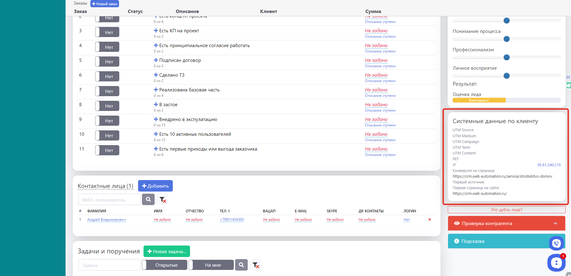 На странице клиента для менеджера и руководителя реализована возможность просмотра системных данных по клиенту: