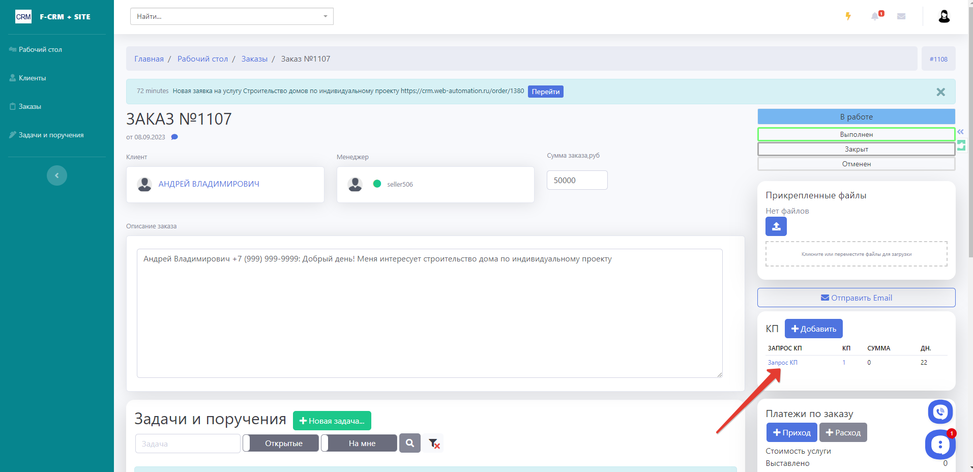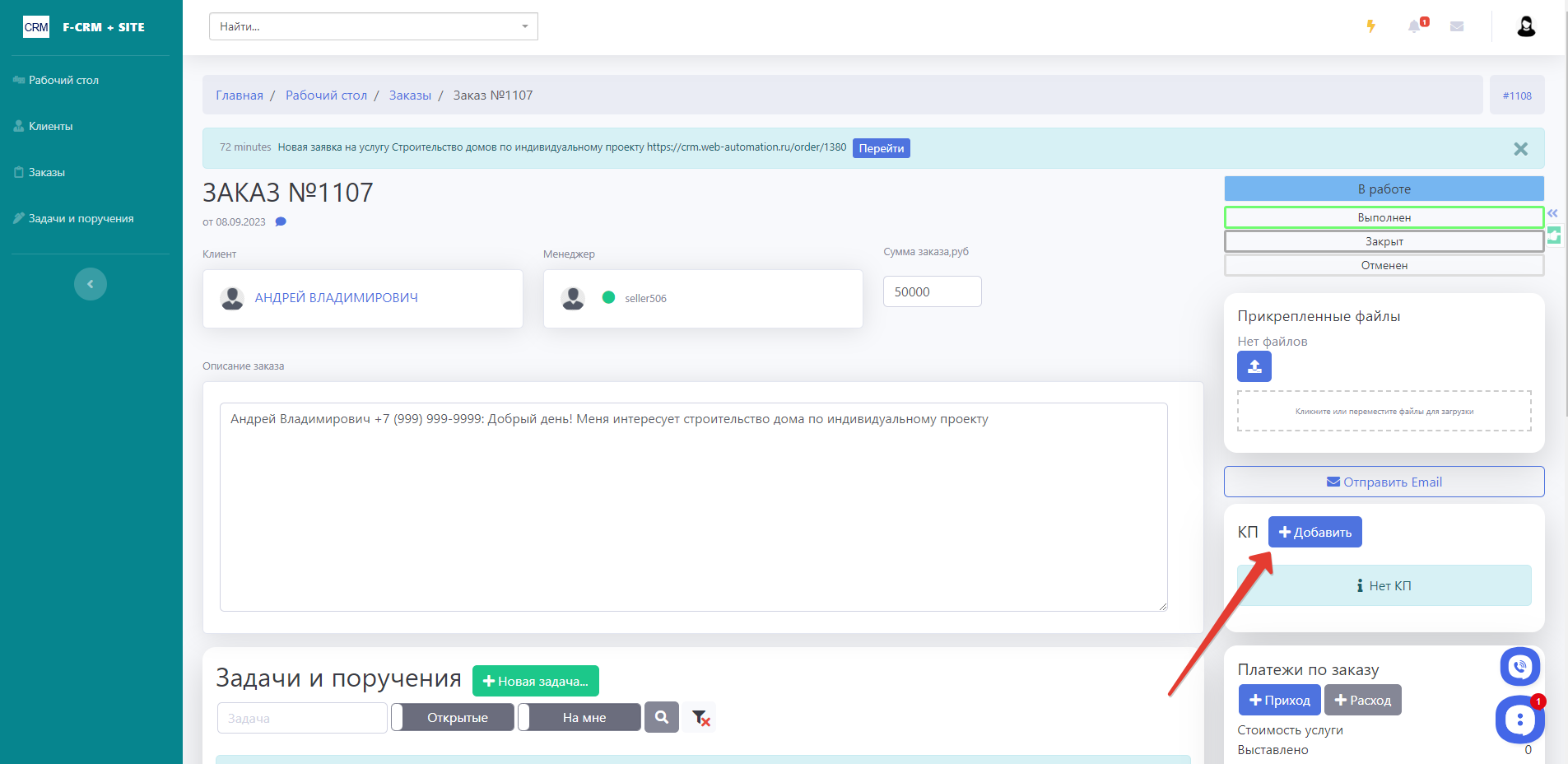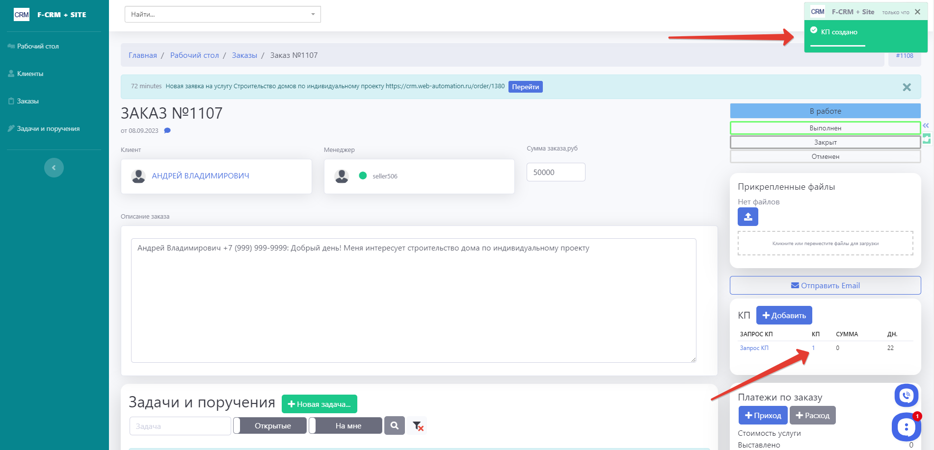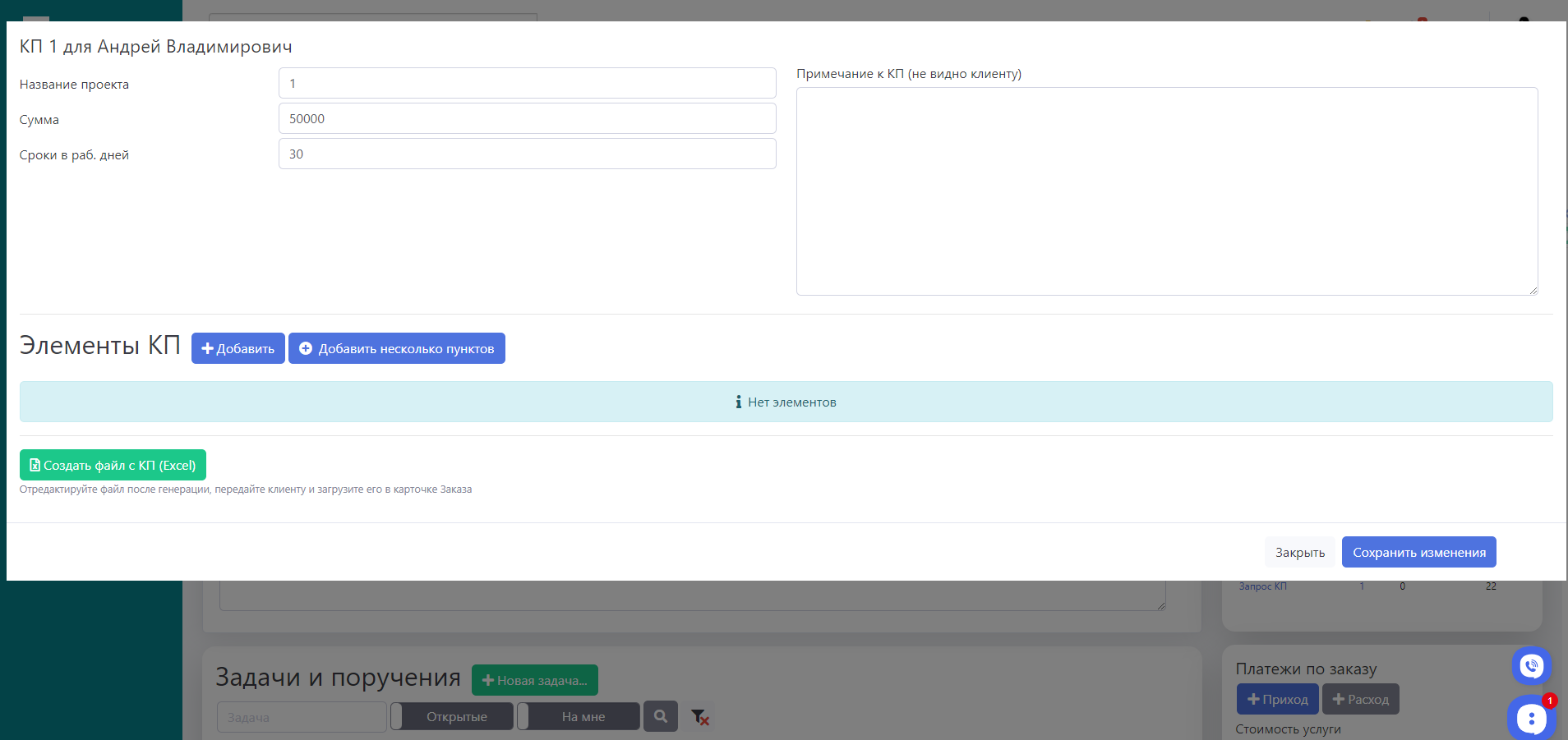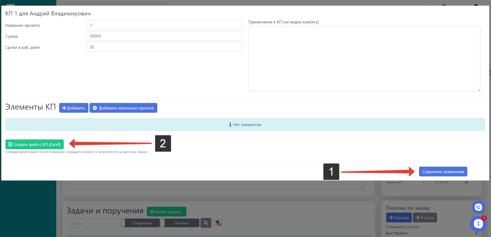 На странице заказа менеджер и руководитель могут создать коммерческое предложение для клиента.