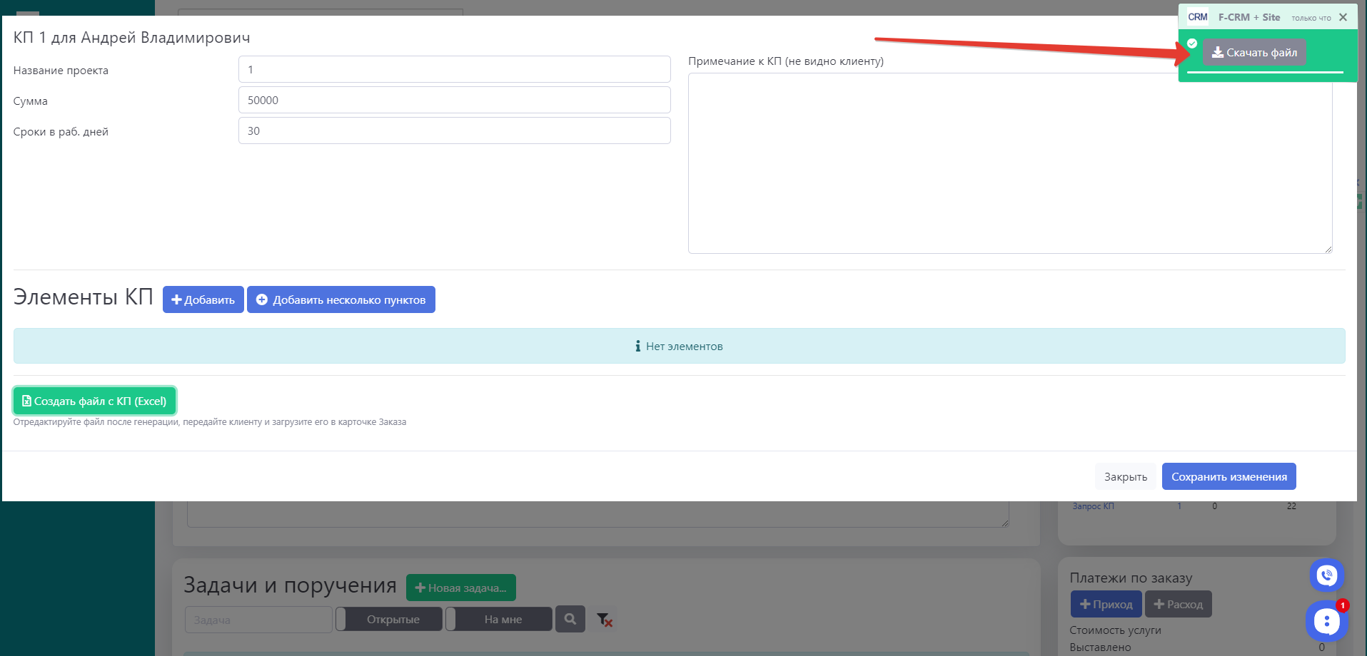 9. После нажатия на кнопку "Создать файл с КП" появится сообщение об успешном создании файла и возможностью его скачать для последующей отправки клиенту: