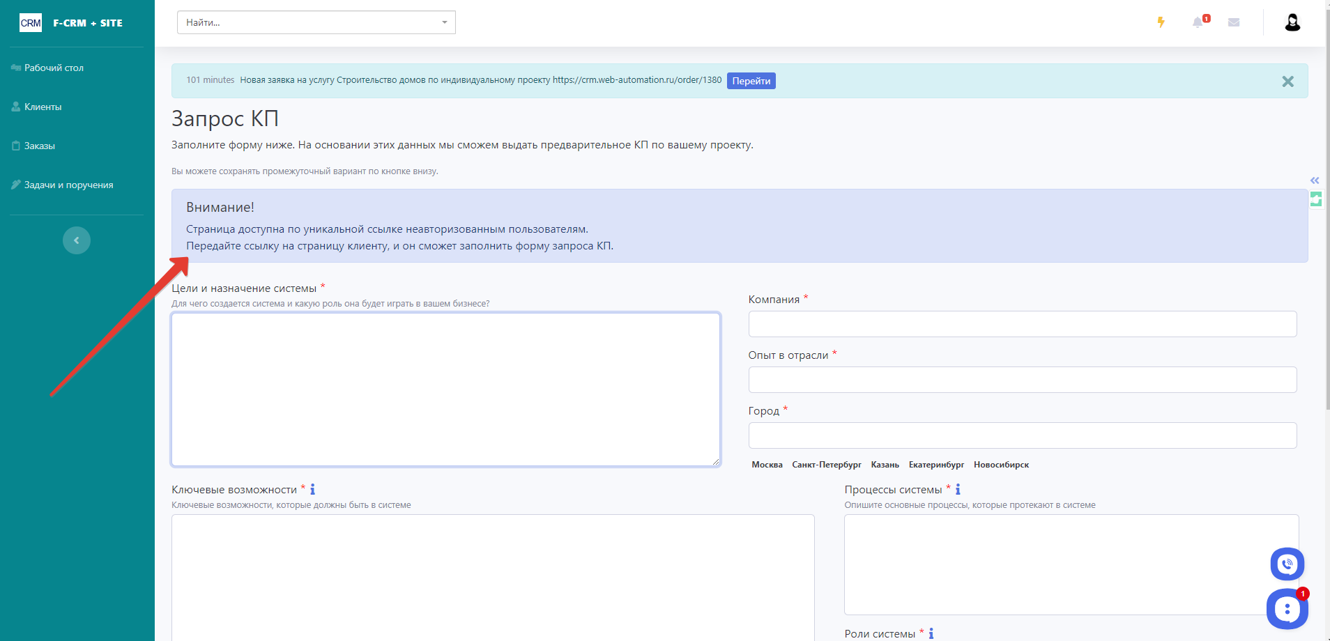 5. После нажатия на кнопку "Запрос КП" откроется новая вкладка с формой запроса КП, которую менеджер может переслать клиенту в виде уникальной ссылки:
