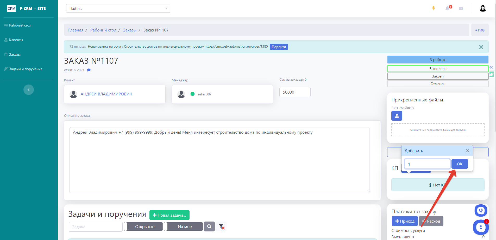 - Работа с заказами Автоматическое создание заказа через заявку Ручное создание заказа через кабинет менеджера Обработка заказа Статус заказа Прикрепленные файлы Отправка Email клиенту Создание коммерческого предложения Создание шаблона коммерческого предложения Генерация Счета-оферты и Акта об оказании услуг Контроль платежей по заказу Комментарии Фильтрация по заказам Оплата по заказу через платежный шлюз Тинькоф Задачи и поручения